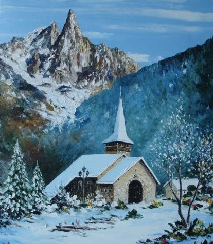 tableau peinture huile sur toile de Chamonix: la chapelle des Praz et les Drus 73cm x 54cm oil painting on canvas Chamonix: la chapelle des Praz et les Drus 73cm x 54cm La chapelle des Praz, réalisée en granit, au milieu du XXe siècle, s’intègre magnifiquement dans le paysage grandiose des Drus ( 3730m …