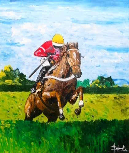 tableau peinture à l’huile sur toile cheval sautant une haie  55cm x 46cm
