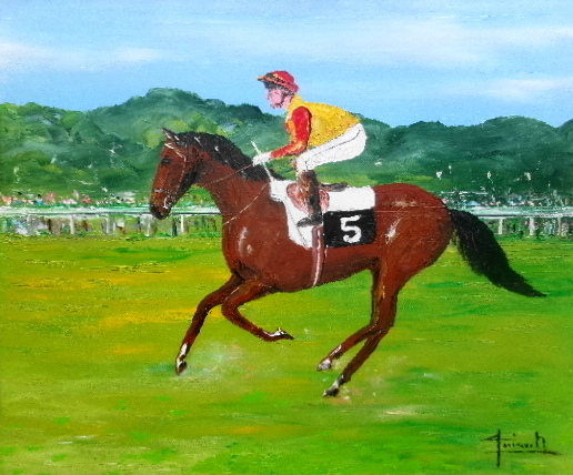 tableau peinture à l’huile sur toile d’un galopeur à l’échauffement  46cm x 55cm